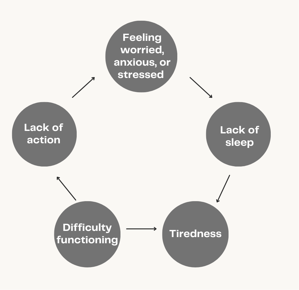 Sleep and mental health have a reciprocal relationship; our mental health can impact our sleep quality and poor sleep can impact our mental health and wellbeing as illustrated in the vicious cycle below: